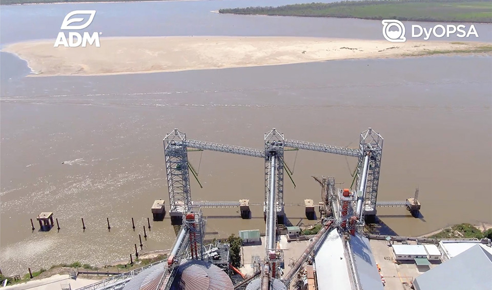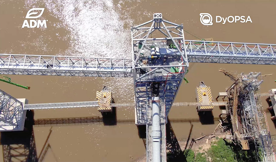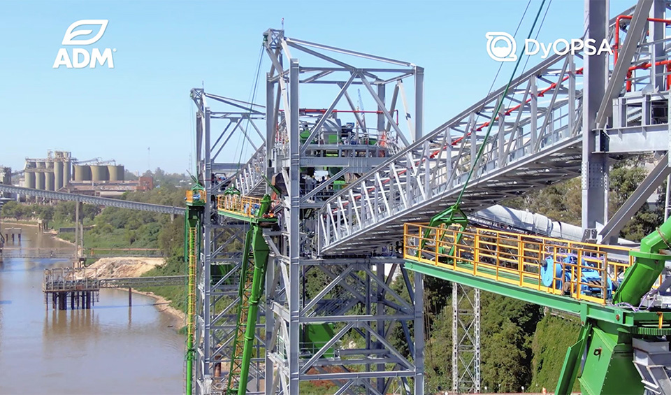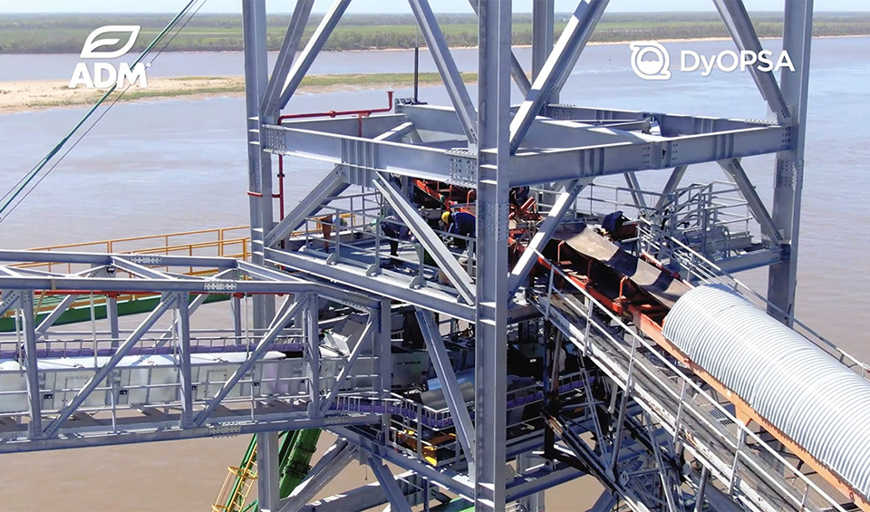 Construcción de una terminal de embarque de granos sobre el río Paraná. Galería de pre-transferencia metálica 95 m de long. Galerías de transferencia y barcazas con estructura met. sobre torres y cabezales y pilotes de Hº Aº - Long, galerías 233 m – 3 pilas Hº Aº 40 m de long. c/u. 4 Duques de Alba y 2 torres de amarre de Hº Aº distancia entre sí 290m.