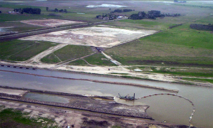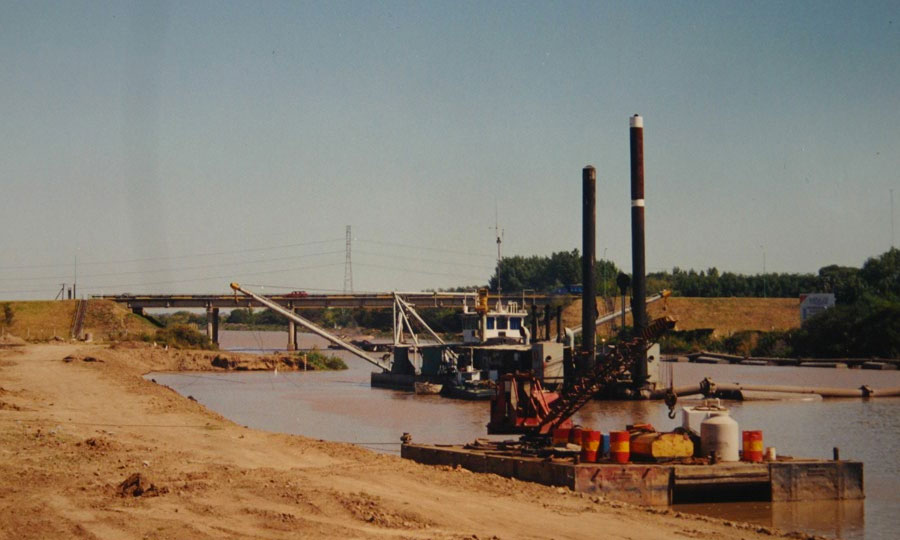 Dragado por refulado y obras complementarias. Equipamiento electromec. Compuertas (4), ataguías, equipos de accionamiento, protec. Flex Mat (8497 m3), barandas peatonales, etc.